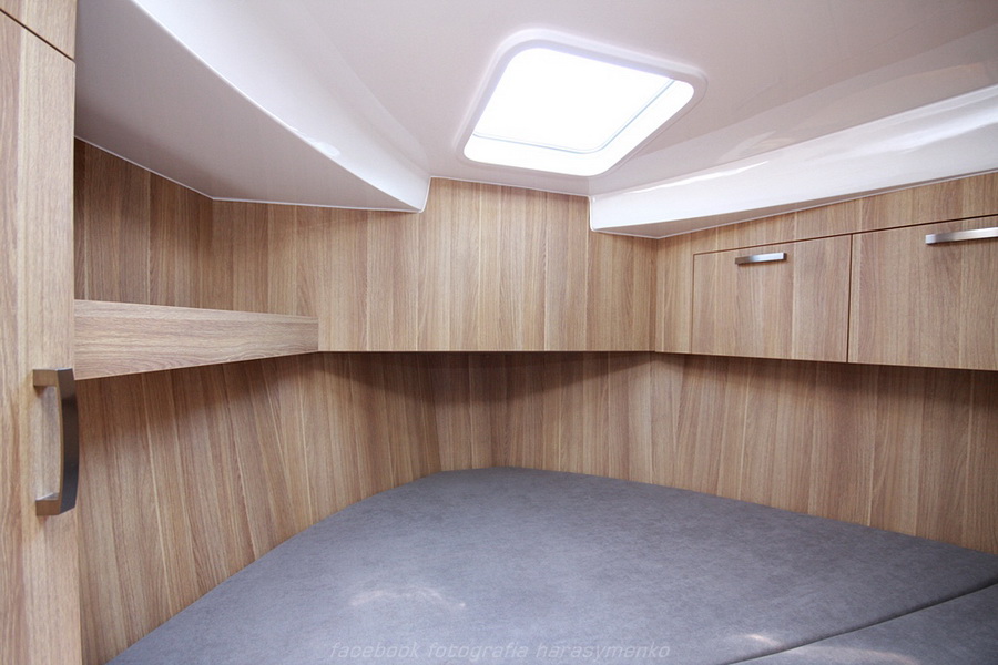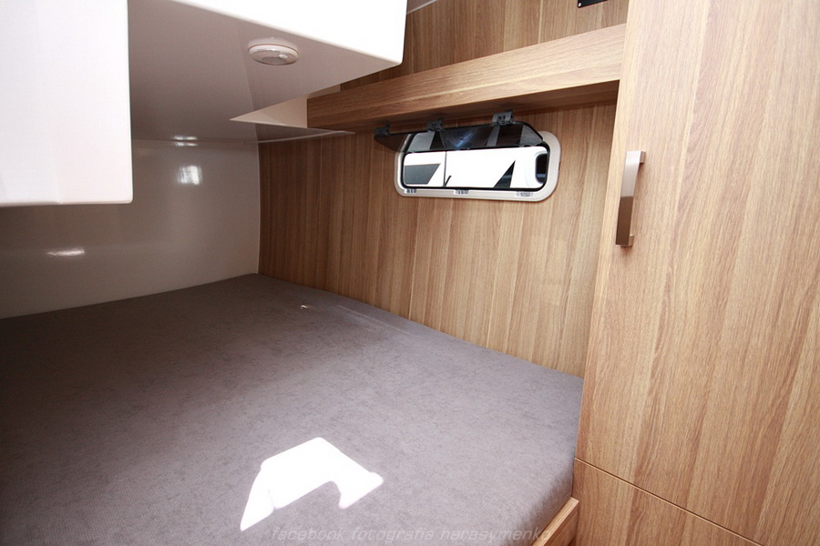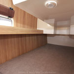 Es gibt drei getrennte Schlafkabinen: im Bug eine Kabine mit einer Doppelkoje (Dreiecksfläche 2,80 x 2,10 m), im Heck zwei Kabinen mit jeweils einer Doppelkoje (Schlaffläche aber nur ca. 1,15 x 1,90 m).