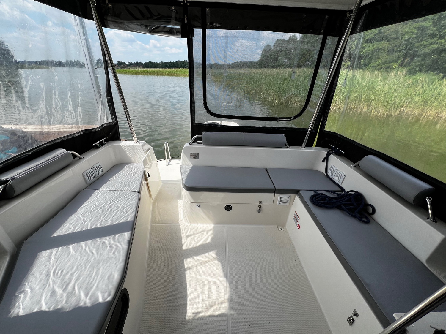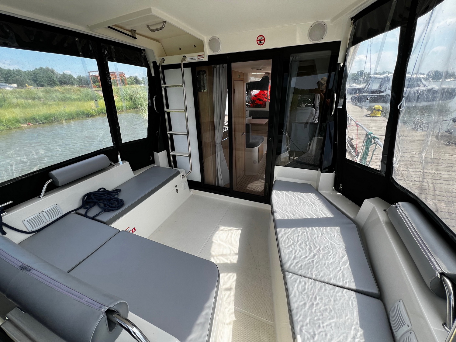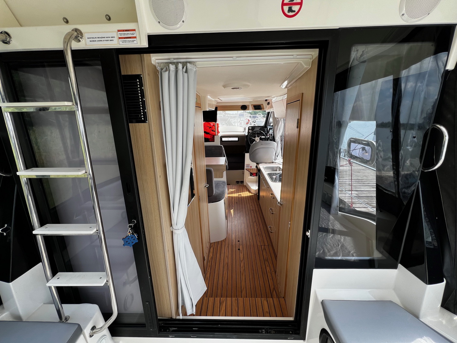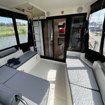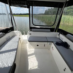Der Außenbereich (Cockpit) wird durch ein festes Dach geschützt. Auf dem Dach der Hauptkabine befindet sich das "Flydeck" mit einer gepolsterten Liegefläche und einem zweiten Steuerstand. Bei gutem Wetter können hier Steuermann und Crew zusammen die frische Luft und Sonne genießen. Der Hauptsteuerstand liegt in der Hauptkabine, somit ist dieses Boot nahezu ideal bei allen Wetterbedingungen.