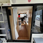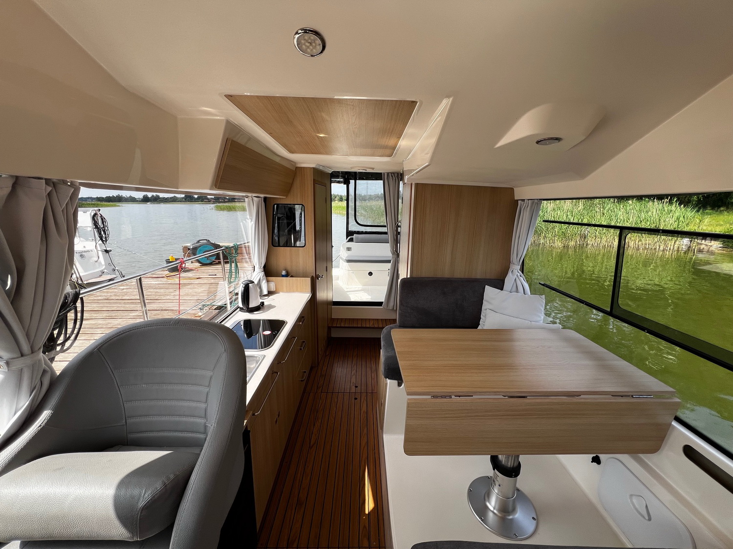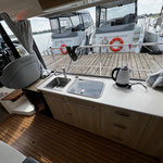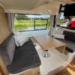 In der Hauptkabine befindet sich ein Essplatz für 4 Personen und eine voll ausgestattete Küchenzeile. Den Essplatz kann man zu einem kleineren Doppelbett umklappen. Ebenso kann man eine Bank des Essplatzes so umklappen, dass man bei Bedarf in Fahrtrichtung sitzen kann. Im Bug gibt es eine getrennte Schlafkabine mit einer großen Koje für 2 Personen sowie einem eigenen Badezimmer, ebenfalls von der Bugkabine ausgehend ist ein weiterer Einzelschlafplatz "unter dem Essplatz", sehr gut für ein Kind geeignet. Im Heck befindet sich die zweite getrennte Schlafkabine mit ebenfalls einer Koje für 2 Personen (relativ flach). Maximal haben 7 Personen auf diesem Hausboot Platz, wir empfehlen eine Belegung mit maximal 4-5 Personen.