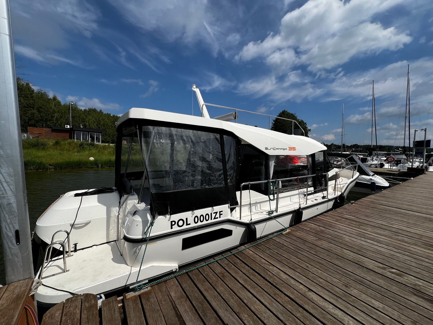 Das Hausboot SUNCAMPER 35 FLY ist ein modernes Boot für bis zu sieben Personen mit dem besonderen Highlight des zweiten Steuerstandes auf dem Dach ("Flydeck").